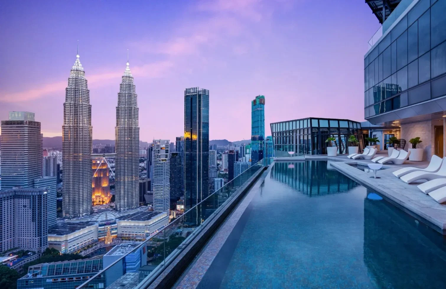 Genießen Sie eine atemberaubende Aussicht auf Kuala Lumpurs berühmte Stadtlandschaft, seine lebendige Skyline und weltbekannte Wahrzeichen wie die Petronas Twin Towers, der KL Tower und Merdeka 118.
