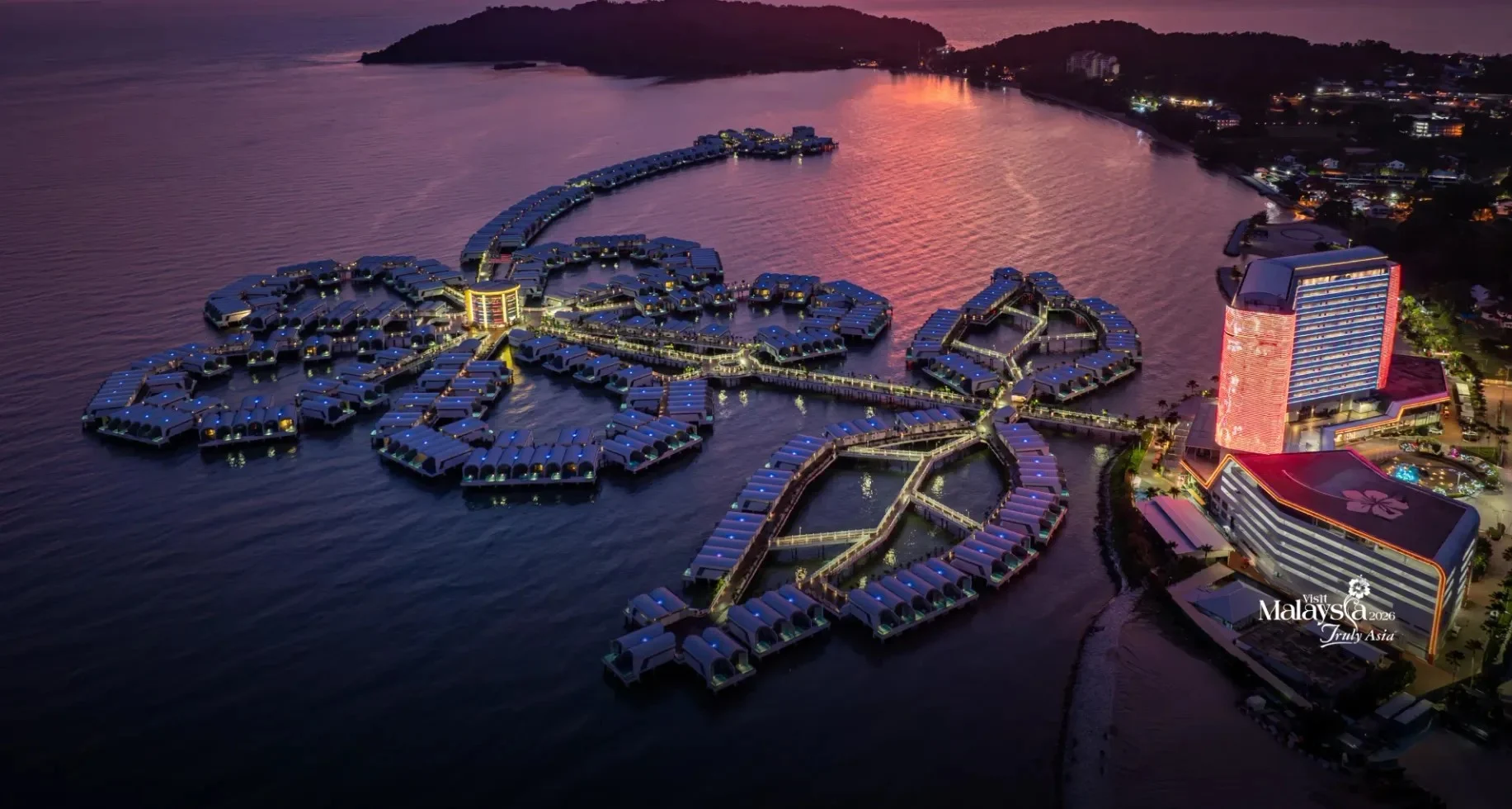Zusammen erstrecken sich die Villen über das Meer und bilden die Form der Nationalblume Malaysias, der Hibiskusblüte.