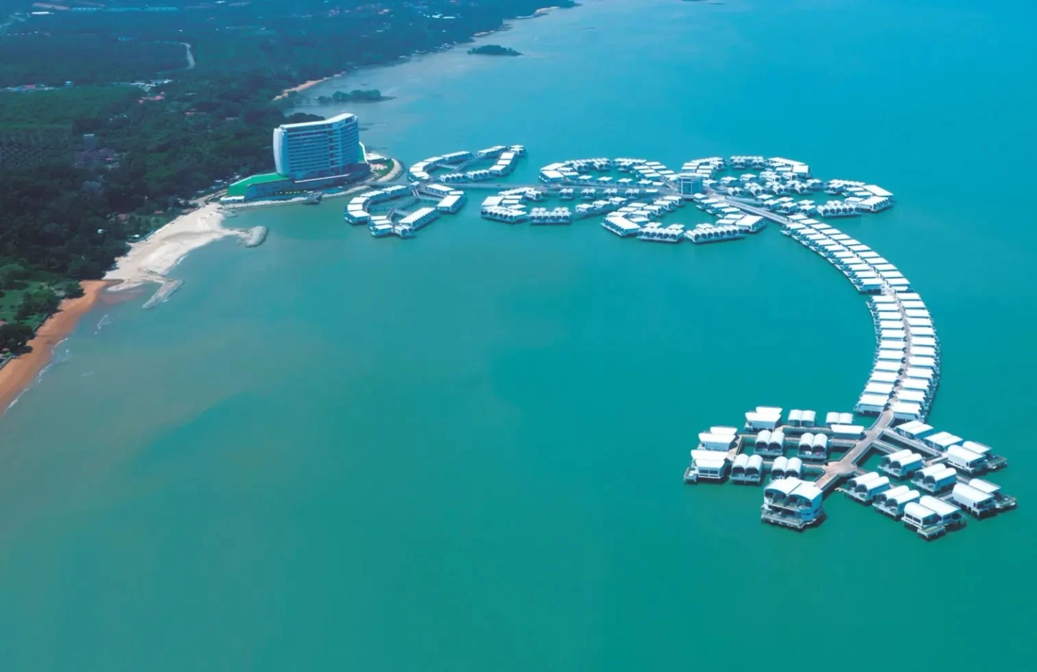 Zusammen erstrecken sich die Villen über das Meer und bilden die Form der Nationalblume Malaysias, der Hibiskusblüte.