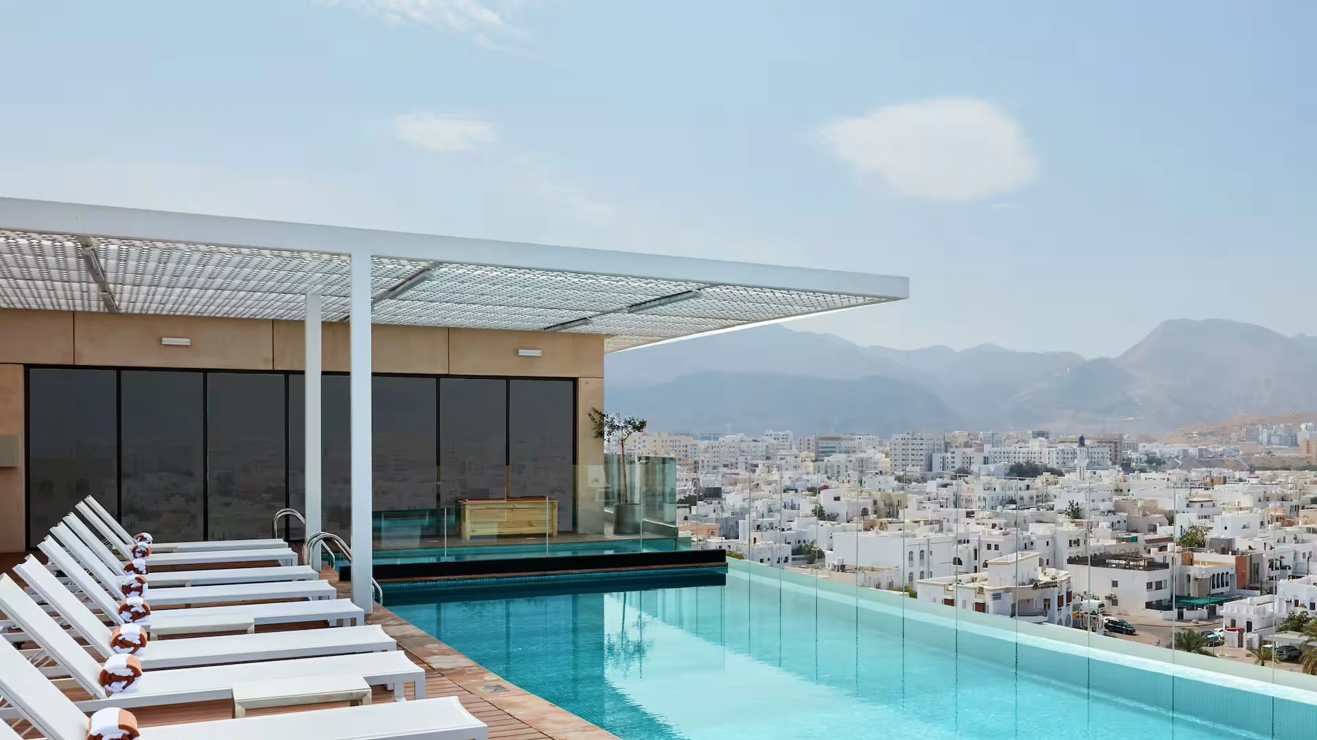Relaxen Sie an zwei Infinity-Pools auf dem Dach mit Bergblick und erfrischen Sie sich an der Saftbar.